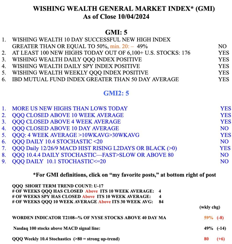 The weekly set-up is strong after last week’s strong close. The 4wk>10wk>30wk and QQQ closed back above its 4 wk average. And the GMI is at 5 (of 6) and still Green, see table below. The weekly 10.4 Stochastic is now=80.5, evidence of a strong up-trend.