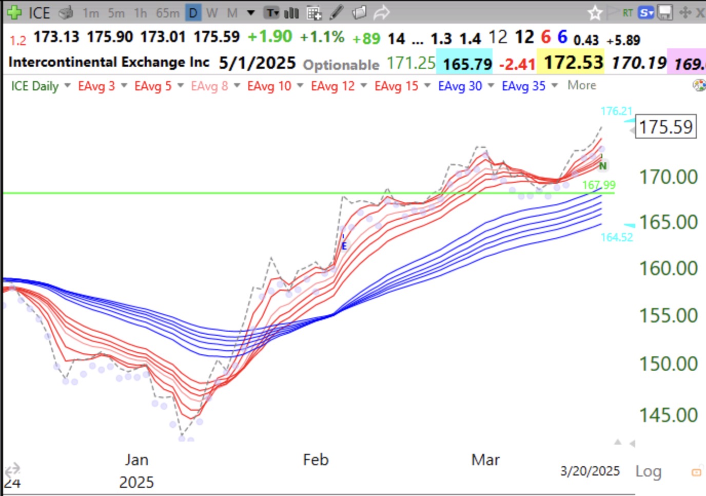 Blog Post: Day 18 of $QQQ short term down-trend; Two exchange stocks, $ICE and $CME have been reaching ATHs after their GLBs, see adapted daily Guppy and monthly charts.