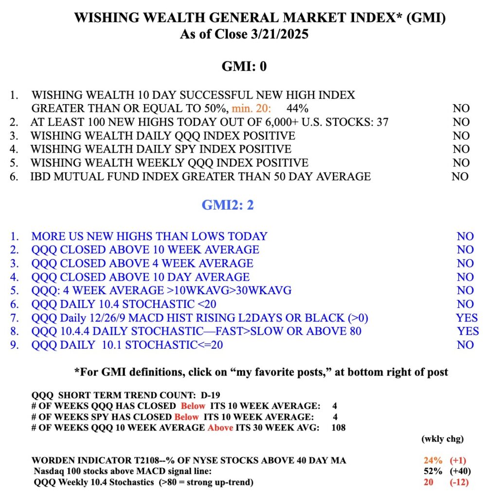 Blog Post: Day 19 of $QQQ short term down-trend; With my GMI=0 (of 6), there is no reason for me to be investing long; I found only 2 US stocks of 6,000 at an ATH on Friday; the odds are against my going long; and small stocks, $IWM, look on verge of Stage 4 decline, see weekly chart