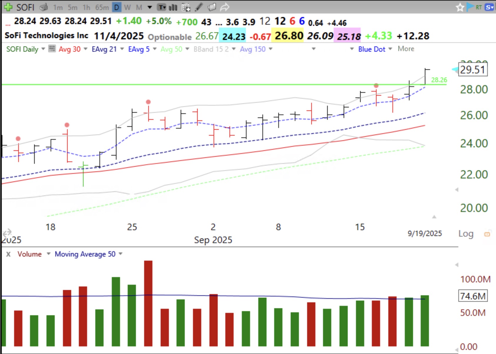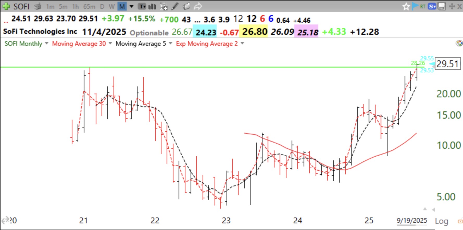 Here are the monthly and daily charts of SOFI. Green line is at $28.26.