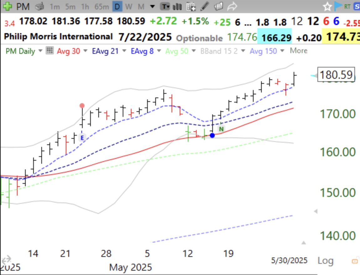 Blog Post: Day 25 of $QQQ short term up-trend; 5 Stocks with my Blue Dot setup on Friday, $PM and $VRNA are examples of prior successful blue dot setups, see daily charts.