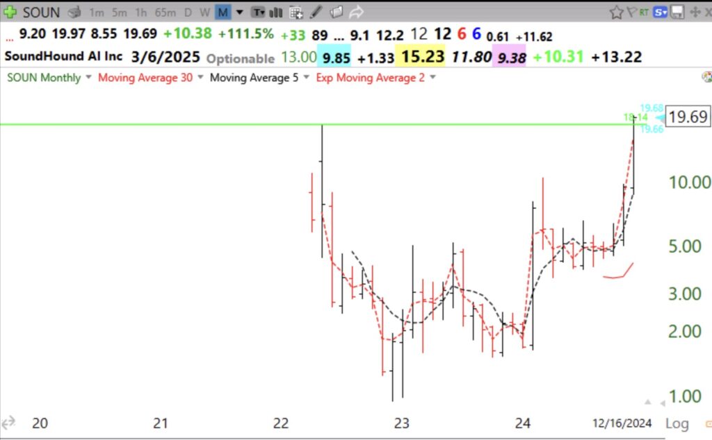 My stock buddy, Judy, has been singing the praises of SOUN for some time. It is 9x its price a year ago. Look at these daily and monthly charts. Note the volume spikes.