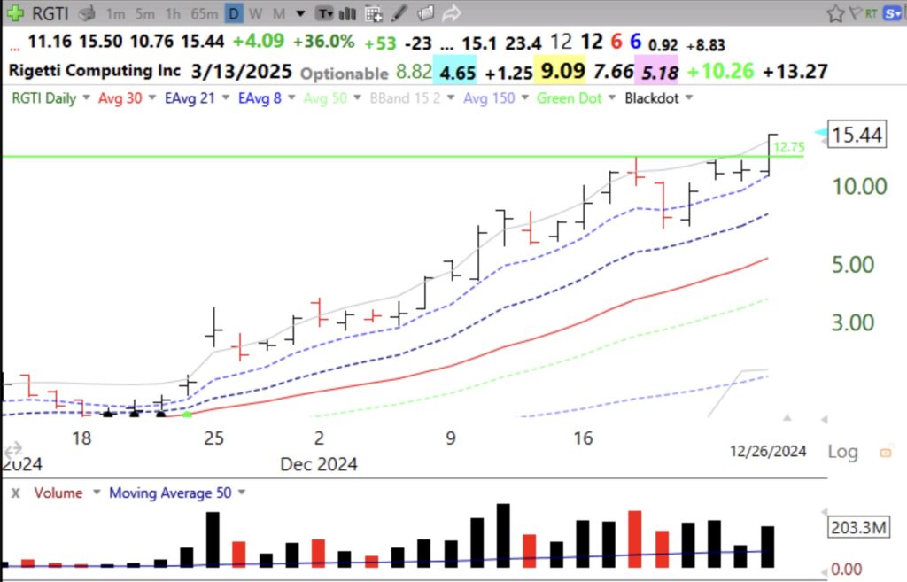 RGTI had a GLB on Thursday with above average trading volume. It is up 15X from a year ago. I always sell a GLB stock if it CLOSES below its green line.