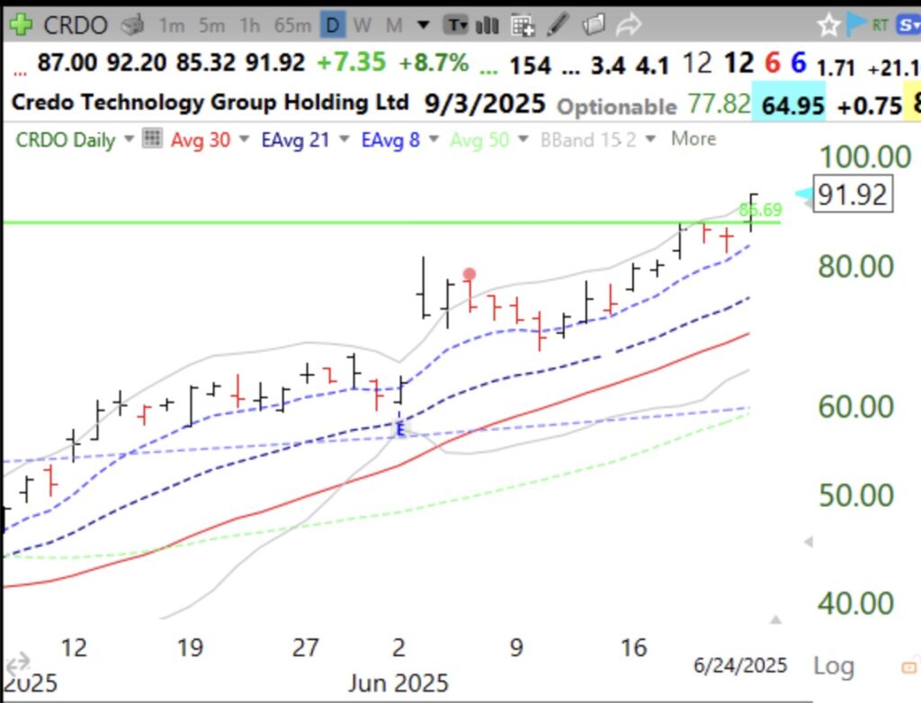 I explained my Blue Dot of Happiness setup at the Boston IBD Meetup on May 21. Note that a blue dot also occurred at the April bottom. The one in March failed. $QQQ could have a GLB this week. So many stocks are breaking out. CRDO had a GLB on Tuesday, see daily chart. So did $PWR. If I buy a GLB, I sell immediately if it closes back below the green line.