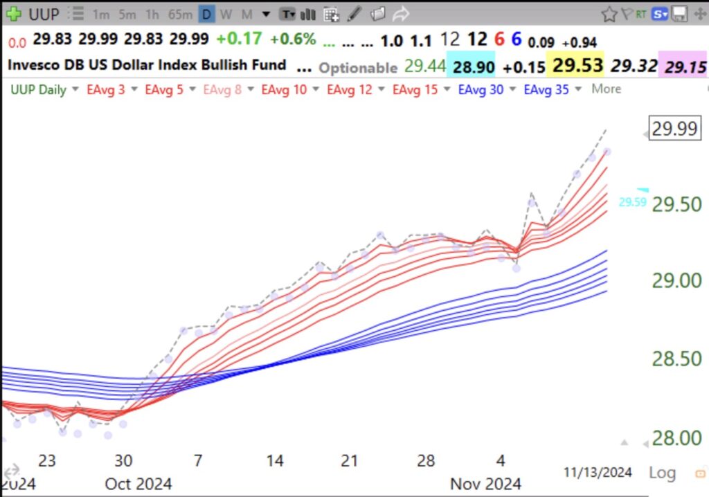 Blog Post: Day 6 of $QQQ short term up-trend; the dollar is climbing as long term treasuries and gold decline, see daily adapted Guppy charts