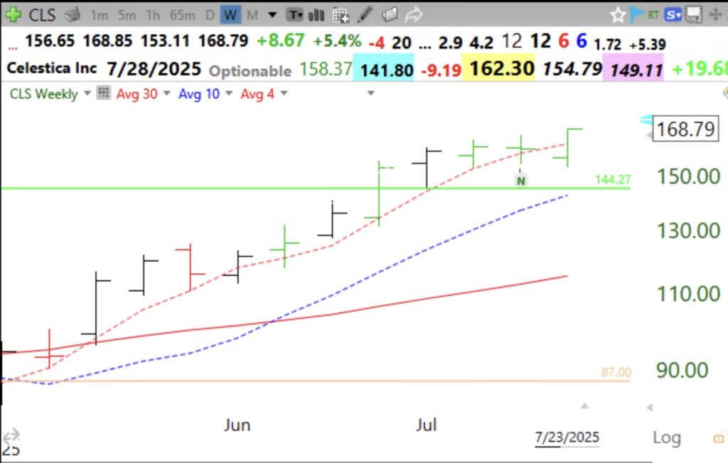 CLS had been tracking its 8 EMA beautifully and when it closed below it on Tuesday, I thought that it had broken trend. However, it retook its 8 EMA on Wednesday after finding support at the 21 EMA. If a setup fails and then succeeds, it can be a good trade to buy the stock back. Note how long CLS is also tracking its 4 wk average (red dotted line). That is another strategy to consider for identifying promising stocks. CLS reports earnings on 7/28.