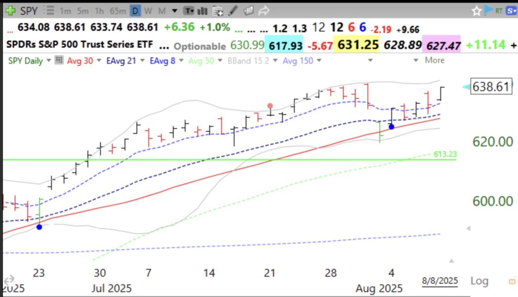 Given that I am a chicken, I sometimes follow my emotions rather than my rules. I tell you when my actions work and when they do not. Given the reversal of QQQ on heavy volume from all-time highs (red dot) on 7/31 and the subsequent high volume decline on 8/1, I exited my positions in my trading account even though my stop losses had not been tripped- a huge mistake because many of my stocks held up. However, when the market bounced and had a Blue Dot oversold bounce signal, I slowly bought back in. Please remember that I am a chicken in my trading accounts. However, I rarely exit my mutual funds in my university retirement accounts, only when the longer term signals I frequently post about turn down. We are not near that type of signal.