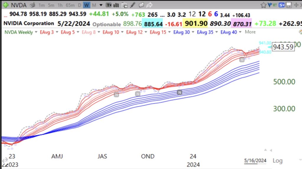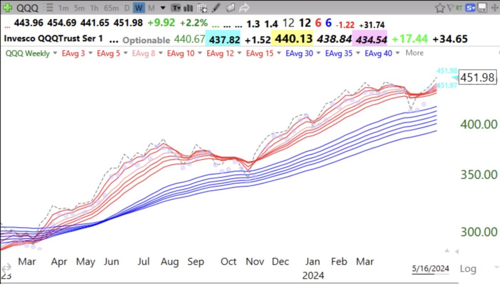 FYI, QQQ has been in a weekly RWB up-trend since May 2023. It did not fail last October. The weekly adapted GMMA chart can show you the true trend of indexes and stocks. In an up-trend you want all of the red lines to be rising above the blue lines with a white space separating them. The dotted line shows the weekly closes. When the white space disappears it is time to exit or trade very defensive.