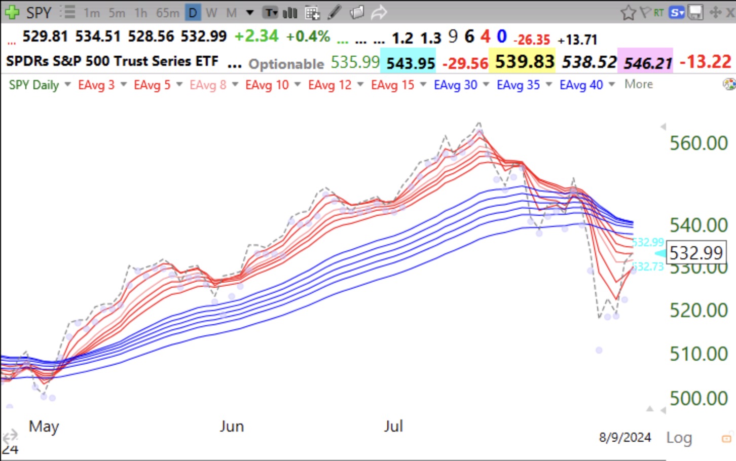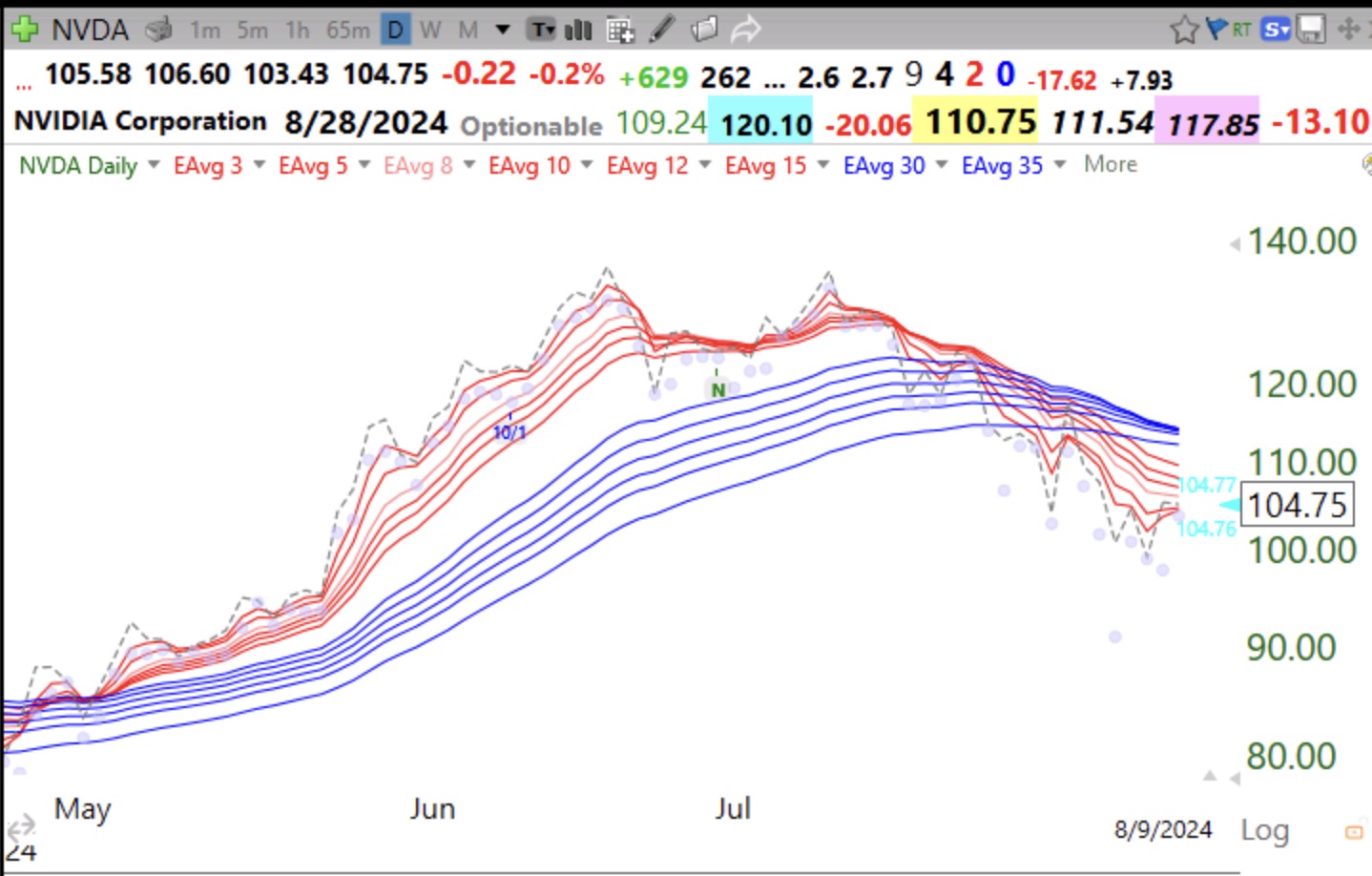 Blog Post: Day16 of $QQQ short term down-trend; Stop trying to predict in advance a decline or bottom and wait for it to happen; $QQQ and $SPY are in daily BWR down trends, see daily Guppy charts of QQQ,SPY,MAGS and NVDA below.