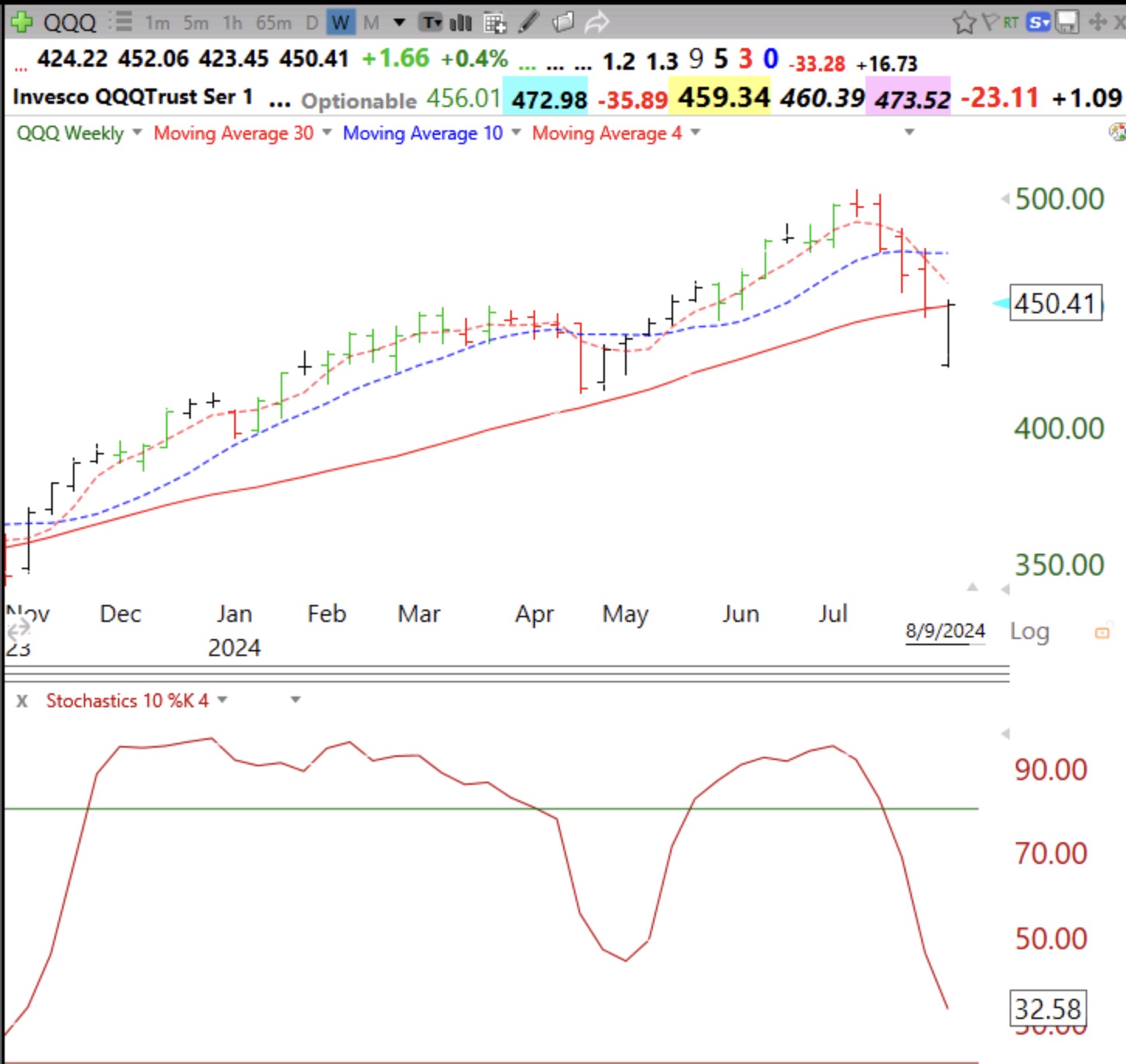 The weekly 10.4 stochastic for QQQ is at 33. Strong up-trends occur with this indicator consistently above 80. Look at the recent evidence for QQQ. We must be patient.
