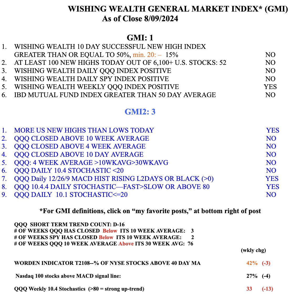 The GMI is RED and it makes sense to me to be in cash in my trading accounts. Vacation time! Plenty of time to get in once there is an up-trend and a daily RWB pattern. One loses a lot of $$$ trying to catch the bottom. NO ONE KNOWS WHERE OR WHEN IT WILL OCCUR. Traders who got in last May had lots of time to ride the up-trend. It is that simple.