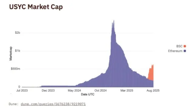 BNB Chain is rapidly emerging as a hub for institutional RWA tokenization. Circle’s USYC, a money market fund backed by U.S. Treasuries, runs nearly 73% of its $669M market cap on BNB Chain.