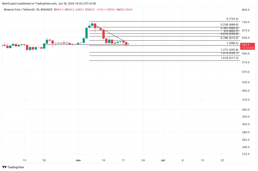As of this writing, BNB is trading at $592.71, having lost 18% of its value since June 6.