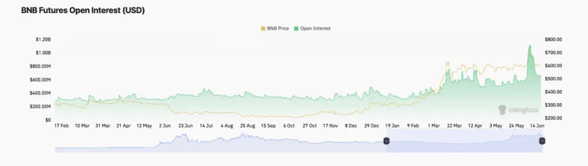 At press time, BNB’s futures open interest is $674 million, having decreased by 33% since June 8.