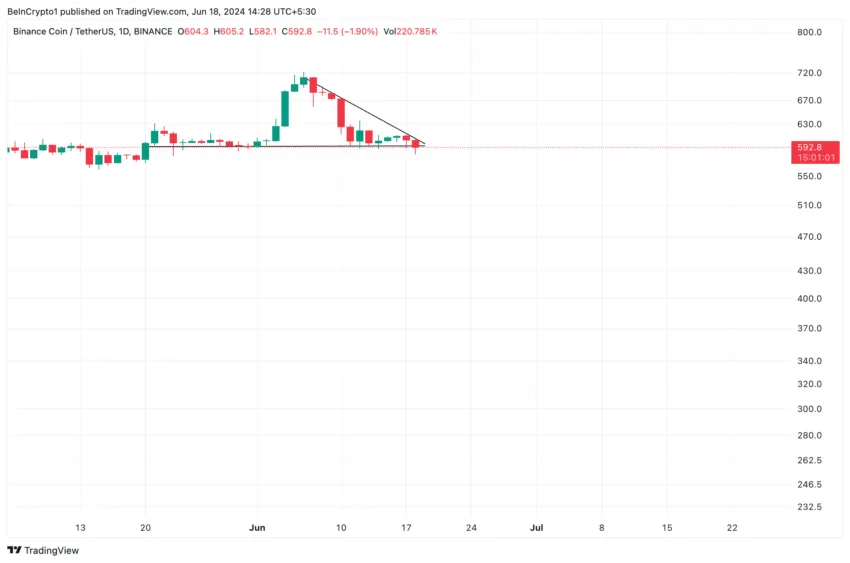 Binance Coin (BNB) climbed to an all-time high of $720.67 on June 6. As selling pressure intensified, the coin’s price declined and has since trended within a descending triangle.
