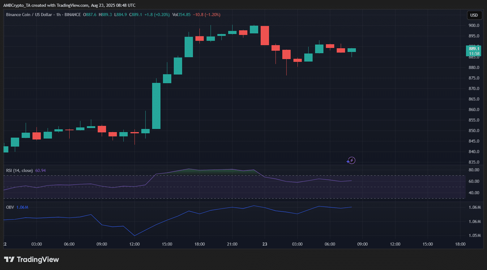 At press time, BNB traded near $889 after briefly touching fresh highs above $890, with signs of cooling momentum on lower timeframes.