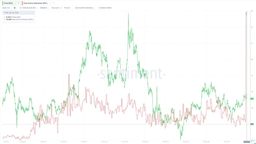 Solana’s user base is exploding. According to data on Santiment, daily active addresses just hit 16.3M, up from just 938K in July 2024. That’s not a typo. Solana has seen nearly 17x growth in on-chain activity in a single year.