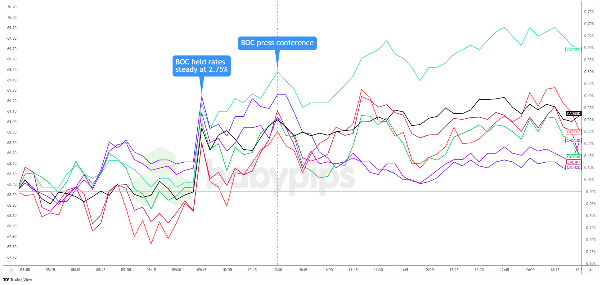 The Canadian dollar, which chopped around in the early U.S. session, surged after BOC paused its interest rate cuts. Traders took the Bank’s tone as relatively less dovish, especially given Wednesday’s uncertain backdrop.