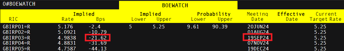Markets currently price in more than 25-basis points worth of easing in November, but September is looking increasingly likely. A dovish statement or press conference, combined with softer CPI, and more importantly lower services inflation, could prompt the majority to consider a possible move in August.