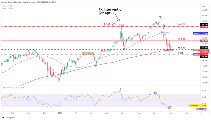 The RSI has rapidly shifted from overbought to oversold, indicating increased volatility. Japanese officials are hoping for a dovish Fed decision, which would lower the Fed funds rate, making 150.00 the next key support level.