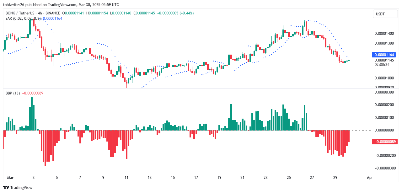 The Parabolic SAR, which uses dots to determine potential market direction, indicates downward pressure when dots appear above the price. This suggests BONK could decline further.