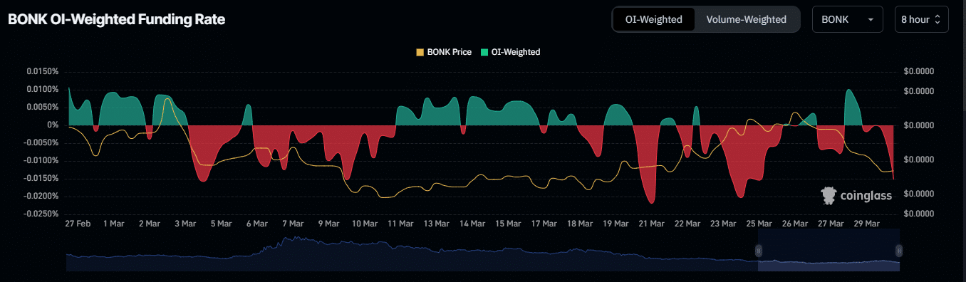 At the time of writing, this metric has crossed into negative territory, with a reading of -0.0152. This region is associated with price declines, making it likely that BONK will see a significant drop.
