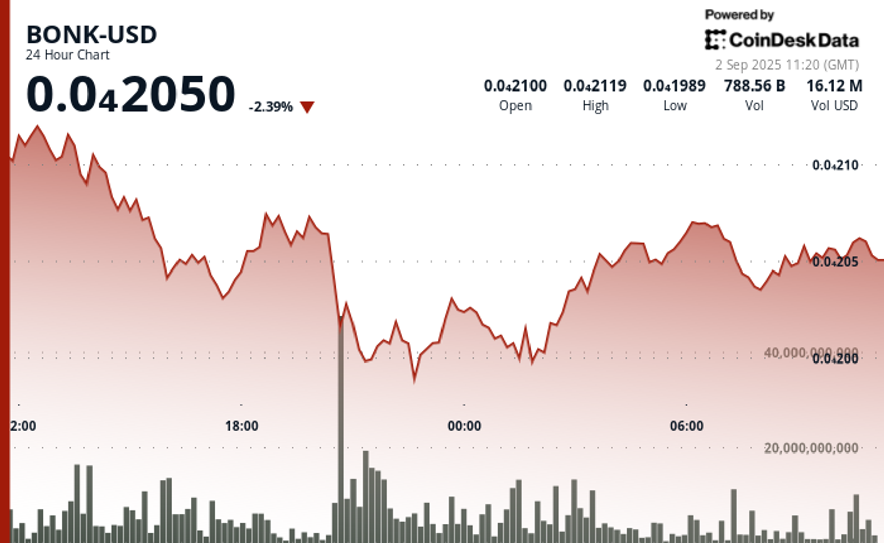 Despite the decline, BONK rebounded at the $0.00001990 support level. By the start of the European morning Tuesday, the token had recovered to $0.00002056, consolidating within a narrower range and signaling potential stabilization after the selloff.
