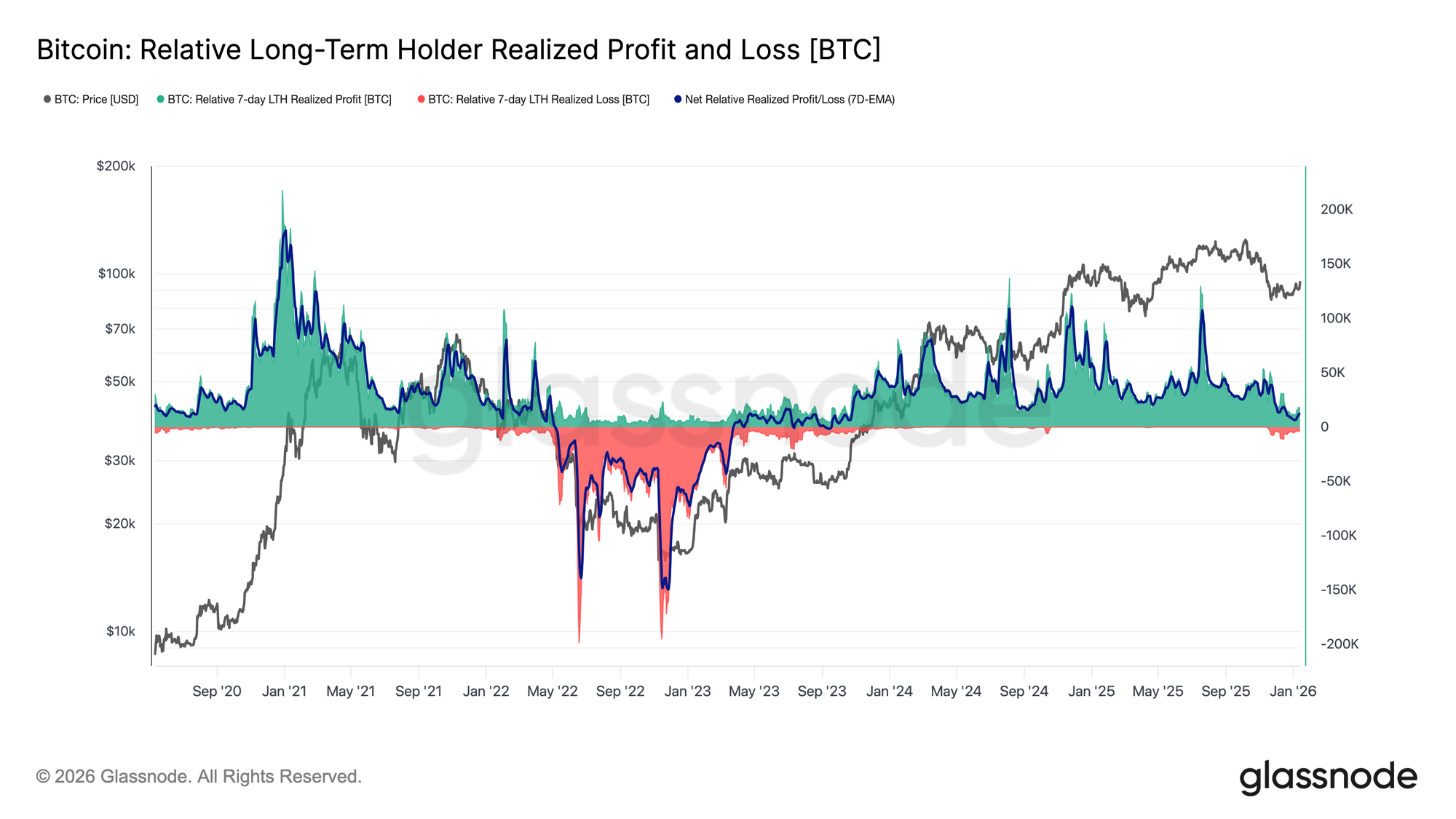 At present, long-term holders are realizing approximately 12.8k BTC per week in net profit, a substantial slowdown compared to the cycle peaks above 100k BTC per week. This moderation suggests profit-taking remains active, but far less aggressive than during prior distribution phases.