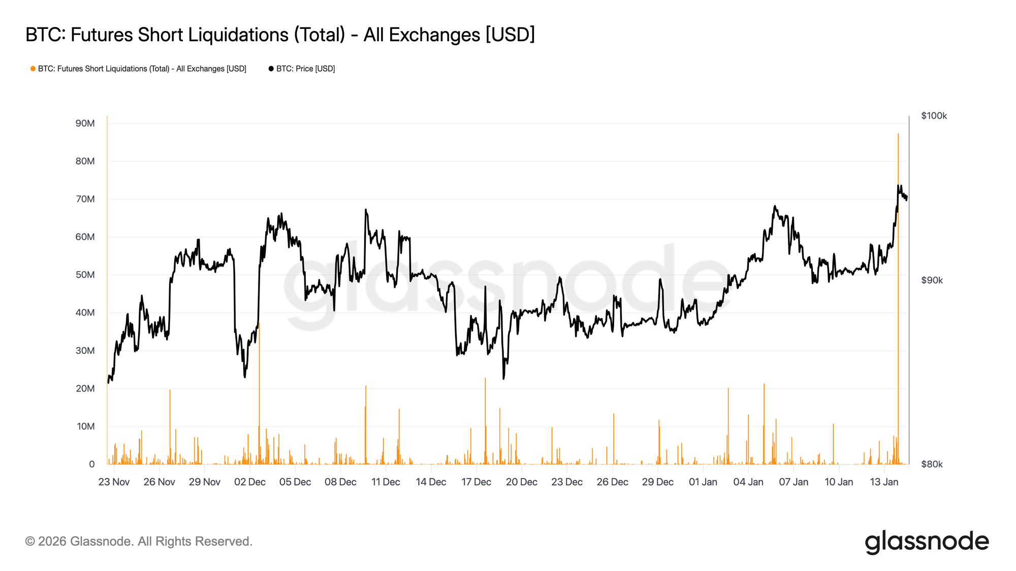 While the push into the $96K region was mechanically reinforced by short liquidations, it also unfolded on relatively thin derivatives volume. Futures turnover has remained well below the elevated activity seen throughout most of 2025, even as prices reclaimed higher levels.