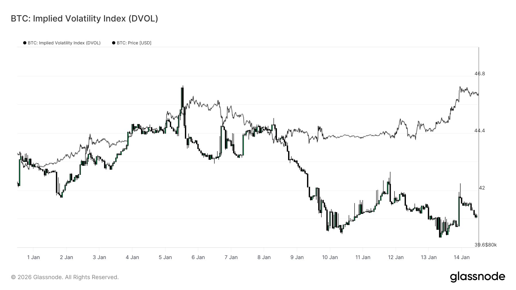 The Implied Volatility Index (DVOL) provides a surface-wide view of option-implied uncertainty by aggregating volatility across strikes and maturities. Unlike at-the-money implied volatility, which reflects pricing at a specific point on the curve, DVOL captures how much volatility the market is embedding overall.