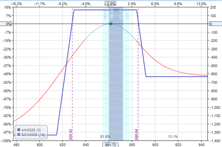 Similar to a traditional iron condor, we sell an out-of-the-money put spread and an out-of-the-money call spread.
