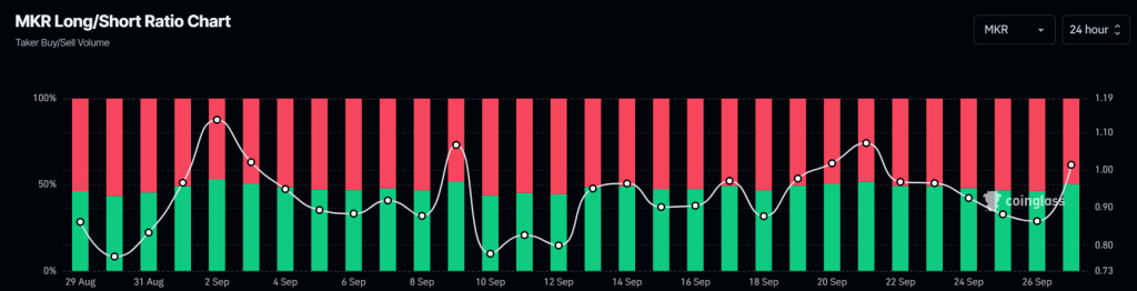 However, MKR’s bullish outlook is further supported by on-chain metrics. According to the on-chain analytics firm Coinglass, MKR’s Long/Short ratio currently stands at 1.031, indicating bullish sentiment among traders.