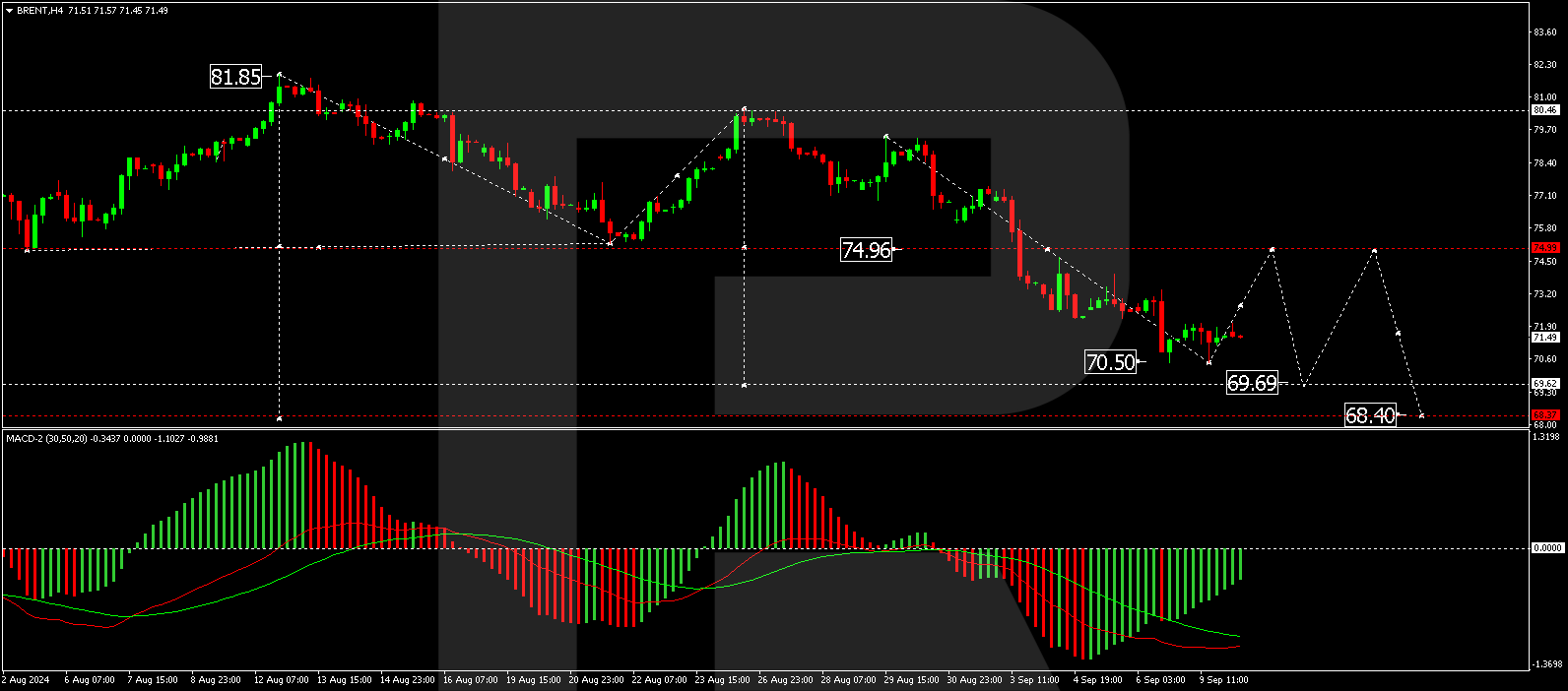 The BRENT H4 chart shows that the market has broken below the 74.96 level and completed a downward wave, reaching 70.50. A consolidation range could form at the current lows today. An upward breakout will open the potential for growth to 75.00 (testing from below). With a downward breakout, the range could expand to the local target of 69.69. This scenario is technically supported by the MACD indicator, with its signal line below the zero level at the lows and poised for growth.