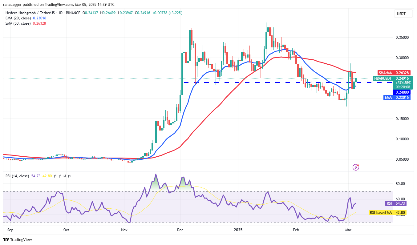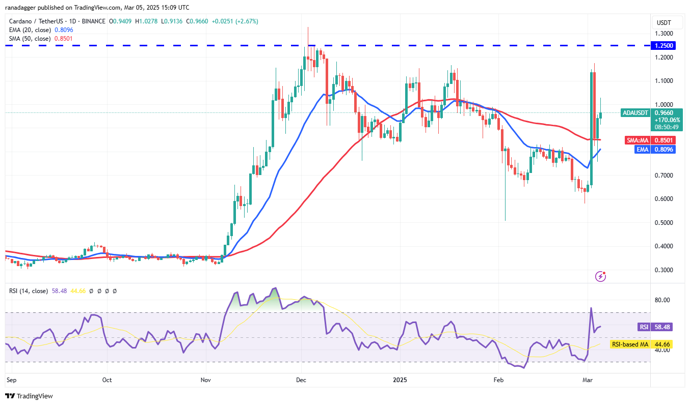 The ADA/USDT pair bounced off the 20-day EMA ($0.80) on March 4, indicating that lower levels are attracting buyers. If the price stays above $1, the bulls will again try to push the pair to $1.25.