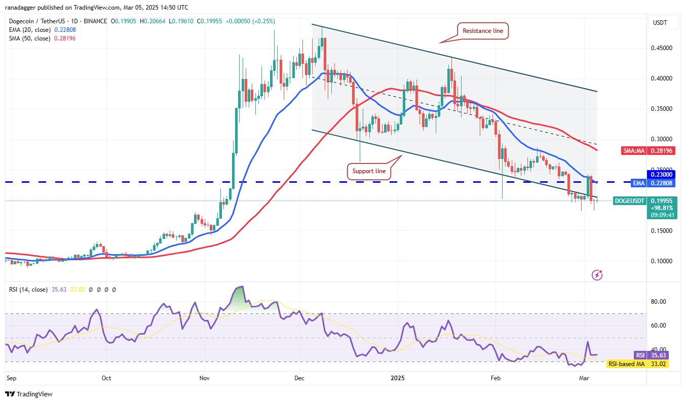 Dogecoin (DOGE) turned back from the 20-day EMA ($0.23) on March 3 and broke below the support line.