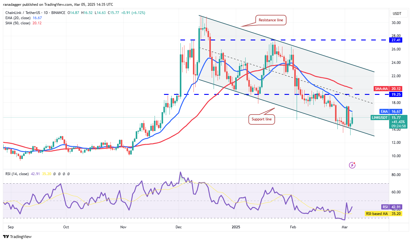Chainlink (LINK) slipped below the support line of the descending channel pattern on March 4, but the bulls purchased the dip as seen from the long tail on the candlestick.