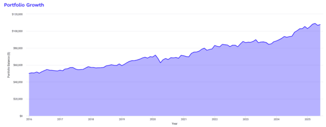 If you had invested $50,000 into this simple three-ETF portfolio back in 2016, by mid-2025, you’d be sitting on about $107,600 before taxes. That’s more than doubling your money in under a decade, with an 8.48% annualized return.