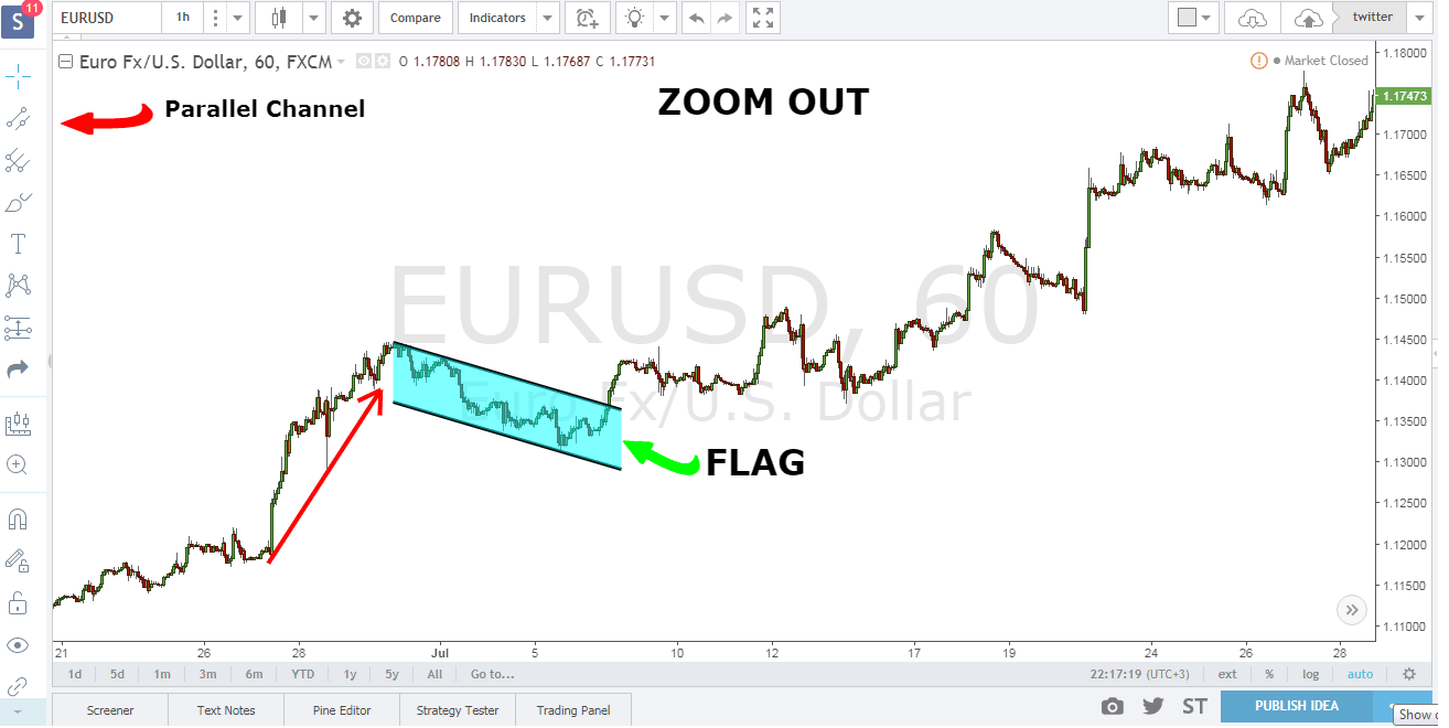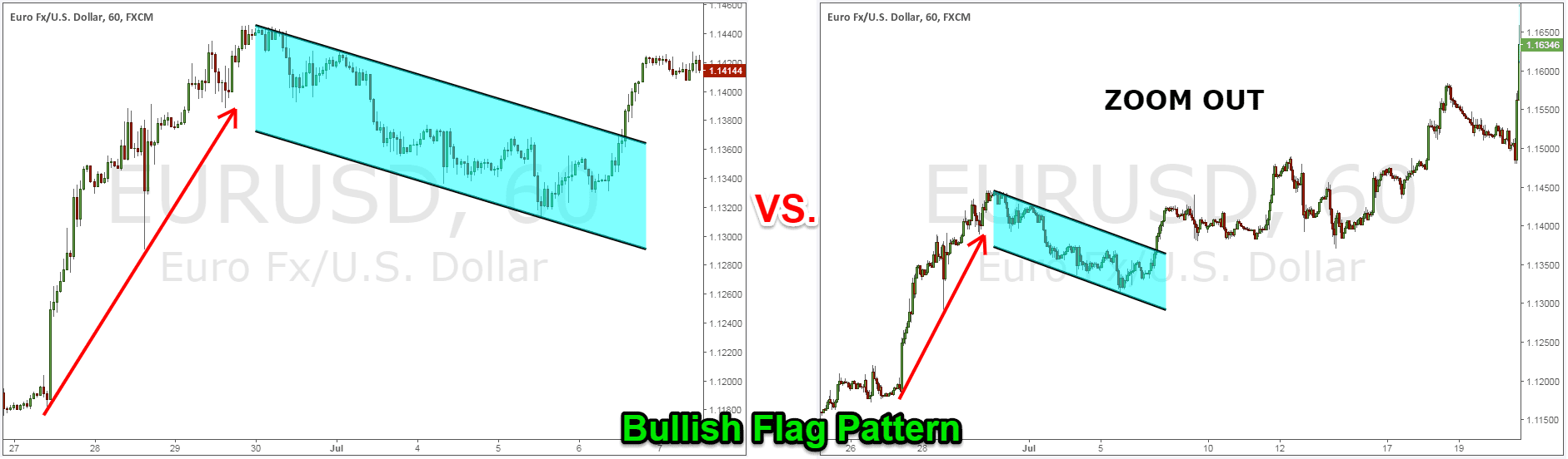 If you’re just getting used to the bullish flag pattern, just zoom out a little bit on your chart because it can make a really big difference. Zooming out your charts you will be able to spot the bullish flag pattern much faster.