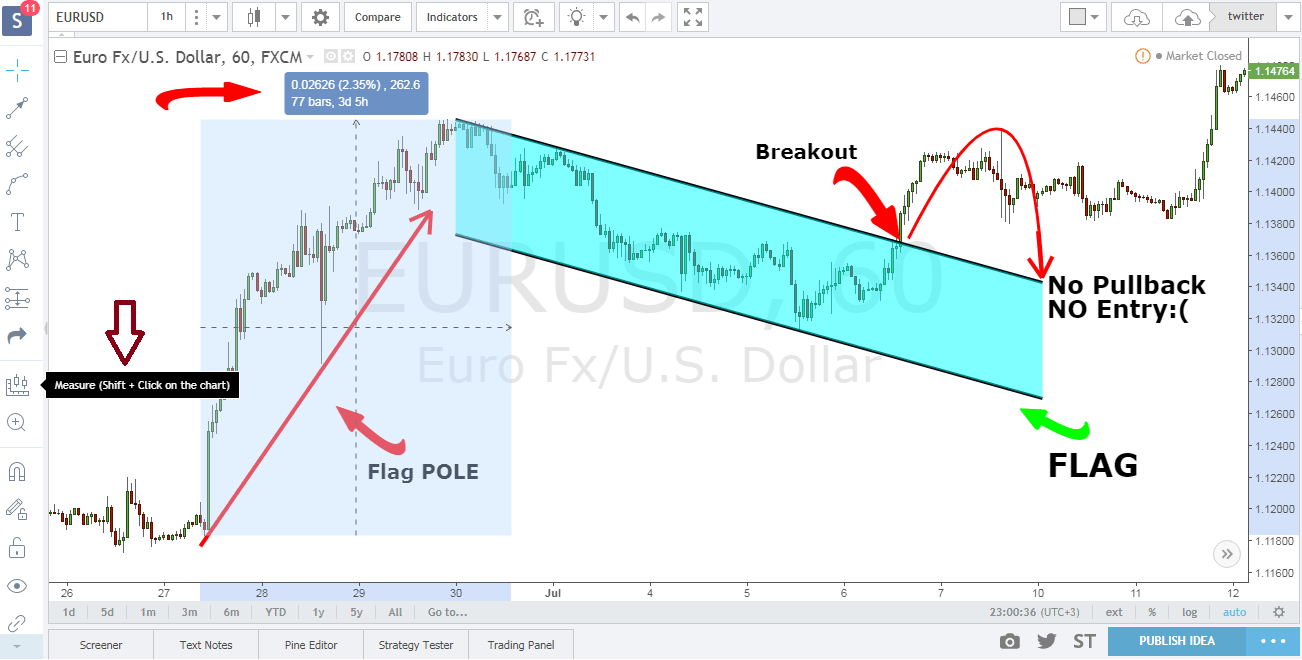 Alternatively, you can wait for a breakout and only enter after a pullback that retests the flag. This is a more conservative approach. However, there is a big risk with this type of chart patterns that you won’t see any pullback once the breakout happens.