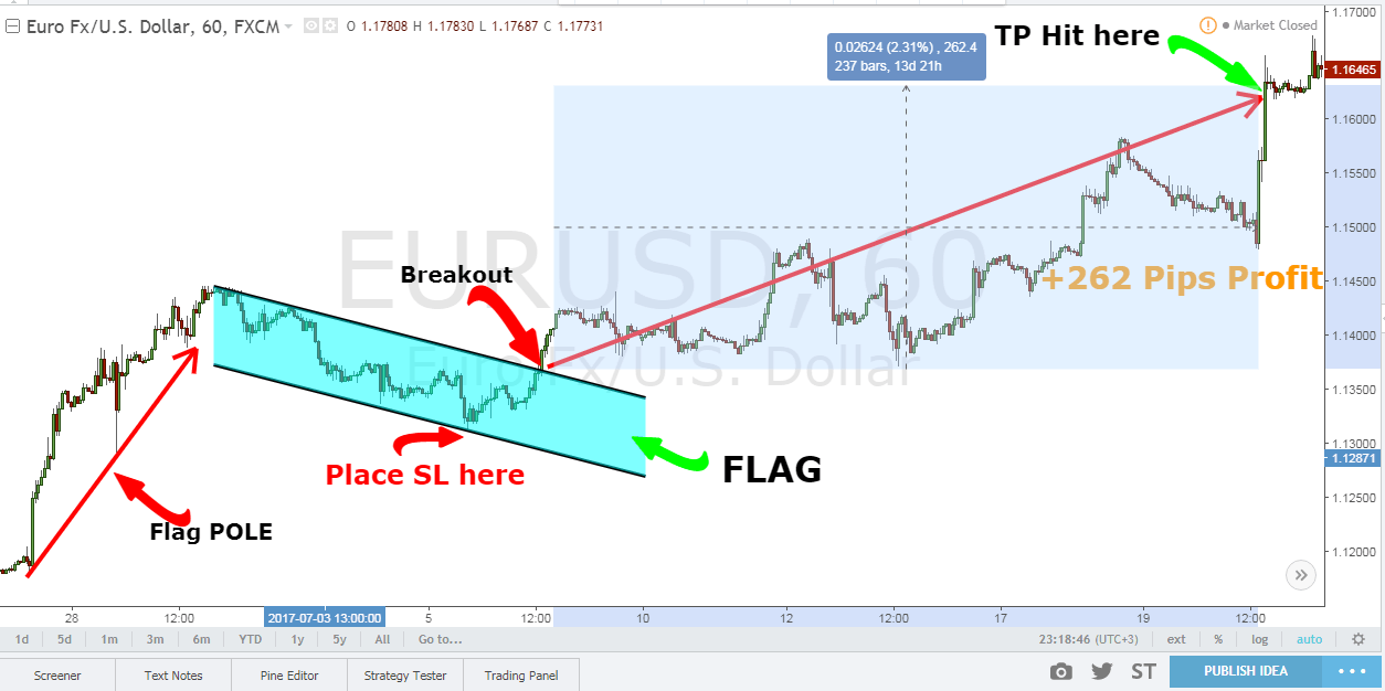 Not only that the bullish flag pattern is a very simple technical indicator, but it can lead to moves that are of the same magnitude as the flag pole movement. In the next section, you’ll learn how to trade bullish flag pattern and how one should trade the best flag pattern strat egy.