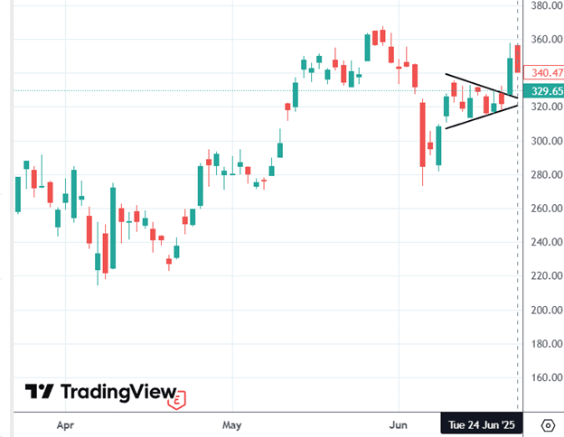 The trader entered a bull put credit spread on June 24, 2025, because Tesla (TSLA) broke out of a pendant chart pattern with a strong bullish green candle the day before…