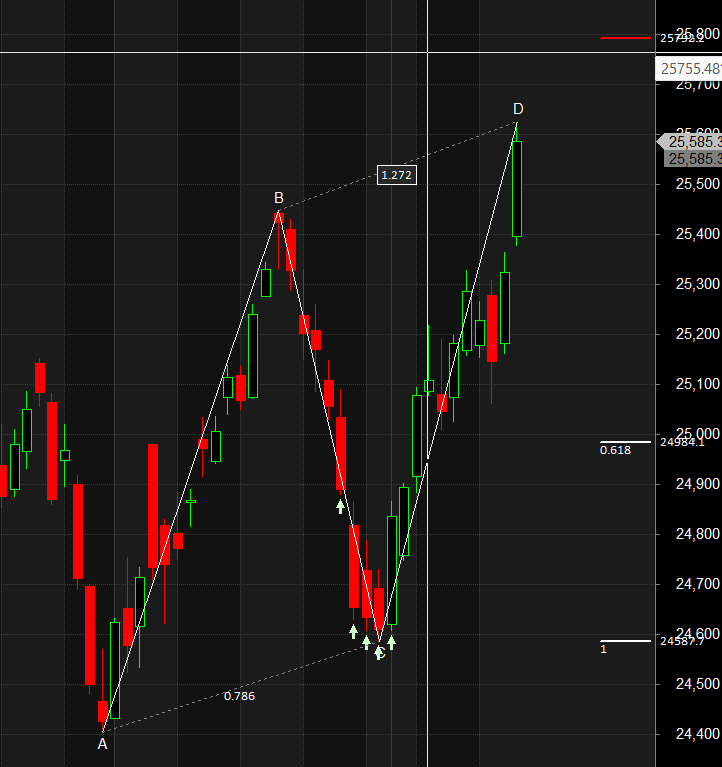 The Bearish Case (The Rejection): If the bulls are unable to secure two consecutive closes above this 25790-25800 PRZ, it will be a major sign of exhaustion. A failure at a key harmonic resistance level would be a significant victory for the bears, likely triggering a sharp reversal and a punishing fall back towards the psychological 25,000 level.
