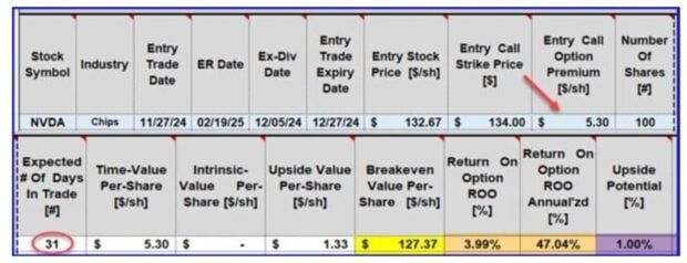 - An additional 1% can be realized if share value moves up to or beyond the $134.00 strike (purple cell)