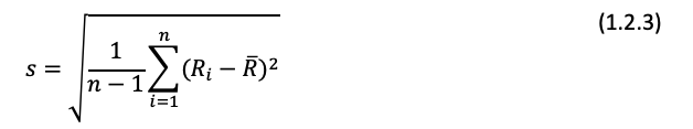 This mean value of returns is one characteristic of numerical data measuring the central tendency of the data. The estimated variance of the random variable R on the other hand, measures the variability of the data around the mean is given by the following formula