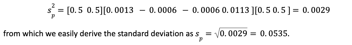 Suppose we split the investment into the weights w = [w1 w2 w3] = [0.4 0.3 0.3]. The computations based on (3.2.1 b) is illustrated below