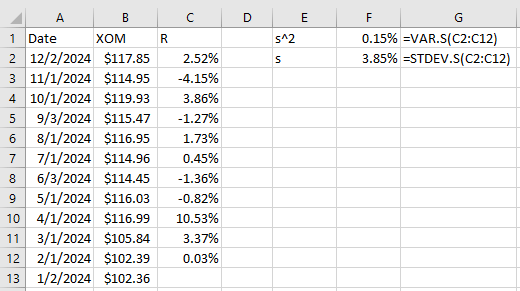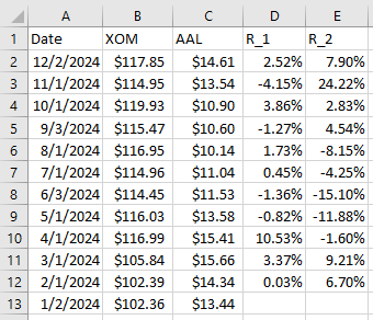 The example includes the Exon Mobil Corp. (XOM) stock prices. The returns are computed according to (1.1.1) in excel. The last column (D) contains the formula for the column C. The first column contains the dates sorted in descending order in format MM/DD/YYYY. So the monthly returns are provided.