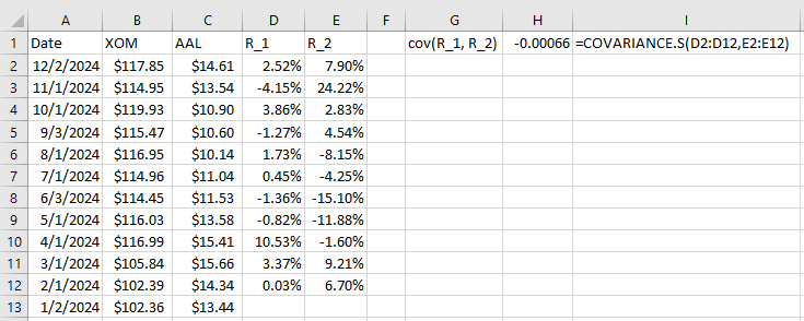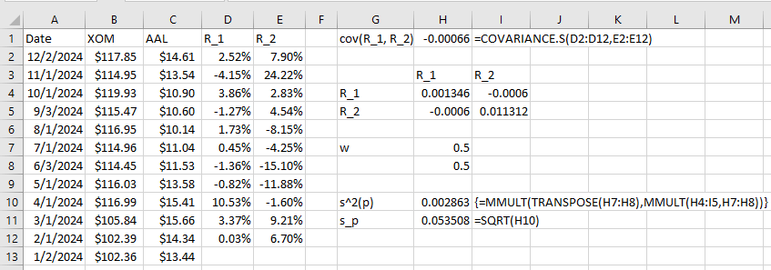 Consider a portfolio consisting of two assets. Exon Mobil Corp. (XOM) and American Airlines Group Inc. (AAL) stocks. These companies are from negatively related industries. In other words, American Airlies Inc. depends on the oil price. Higher the oil price (i.e. higher the XOM price ) lower the AAL price is and vice versa. In other words, airlines and oil producing industries move in opposite directions. Their monthly prices for the last 12 months are given below