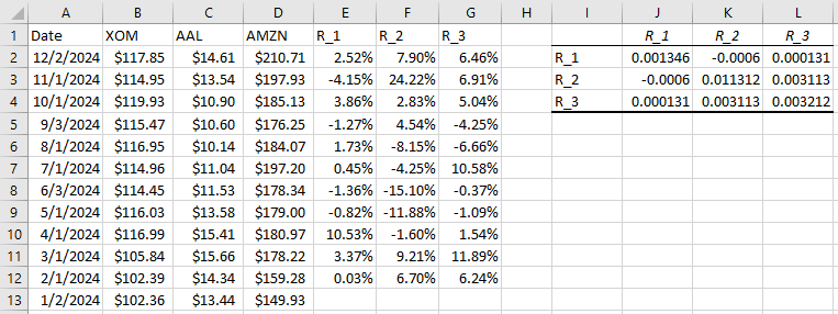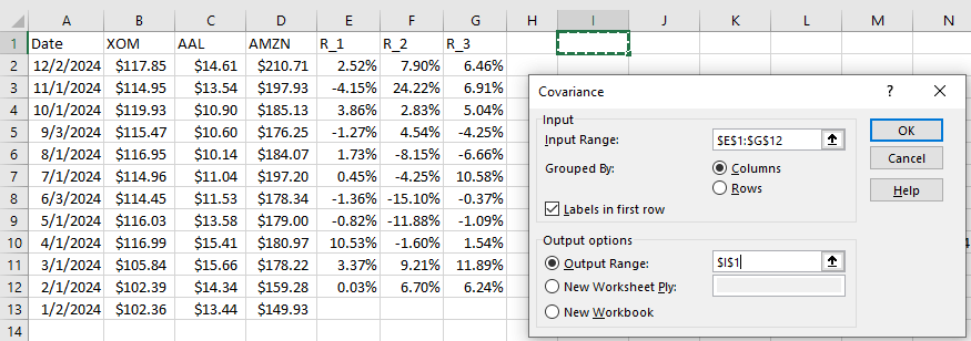 We proceed to construct the covariance matrix for a portfolio consisting of more than 2 assets. First, we add another stock – Amazon.com Inc. (AMZN) to the existing portfolio. So, it now becomes N=3 asset portfolio. The returns for all stocks are computed by (1.1.1) according to the method we discussed above. Then the covariance matrix elements can be computed by (2.1.1 b). In excel this is done by covariance function of Data Analysis package in Data tab.