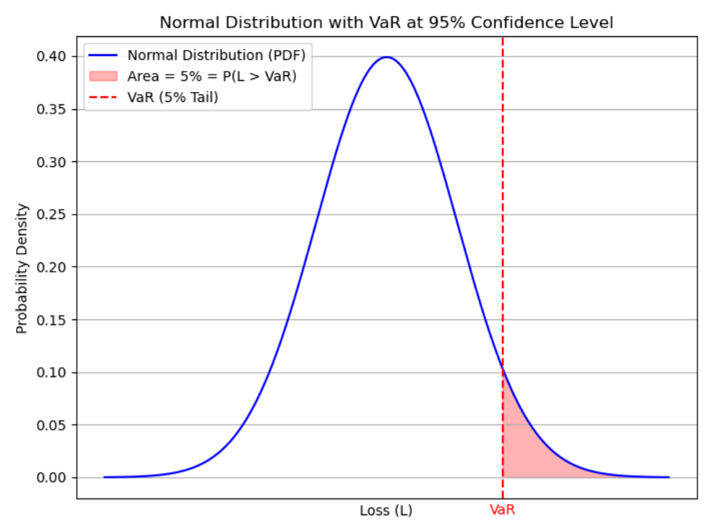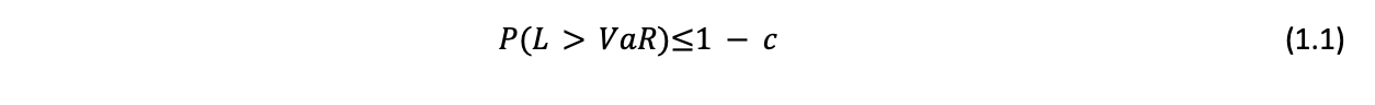 Computing probability obviously assumes some kind of knowledge of the shape of distribution of losses. The following image illustrates the VaR as a threshold level as given in (1.1).