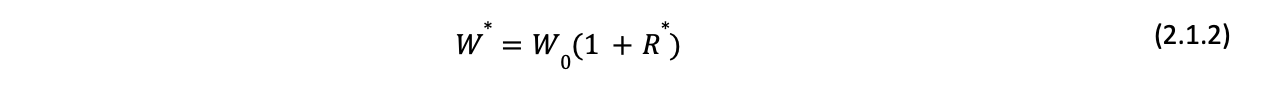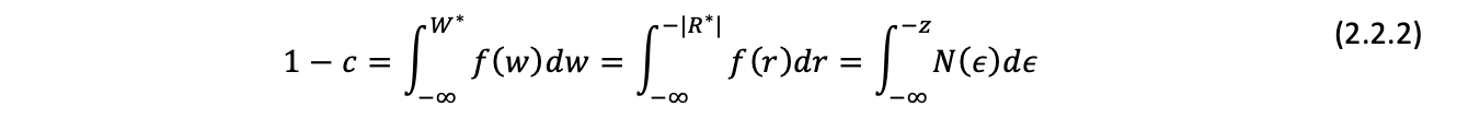Essentially, all integrals in (2.2.2) represent the same quantity – the probability of the portfolio value at the end of the investment horizon ending up within the range of \( (-\infty, W^*) \) is \( 1 – c \). This quantity obviously coincides with the probability that the portfolio return will fall within \( (-\infty, -|R^*|) \). Having converted \( R^* \) into \( z \) standard normal quantity by (2.2.1), we clearly see that above mentioned integrals yield the same result as a standard normally distributed random variable falling within the interval \( (-\infty, -z) \).